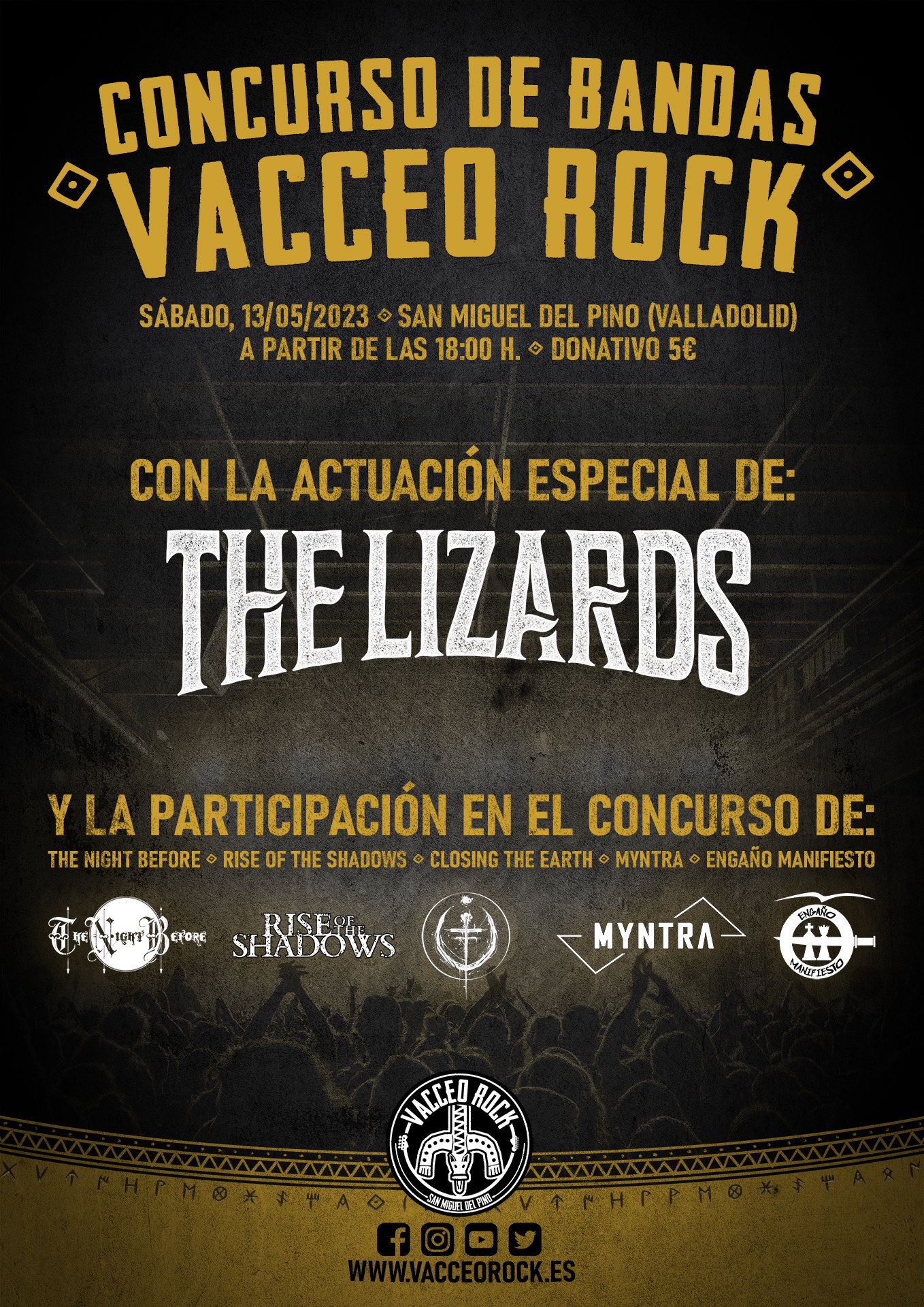 Ven a disfrutar de los 5 finalistas, asi como de The Lizards para poner el broche final al I Concurso de Bandas VacceoRock. Tendréis la opción de votar a los grupos que más os gusten y el ganador tocará el 17 de Junio en el Festival junto a Saratoga, DelAlma, Zenobia y Xeria